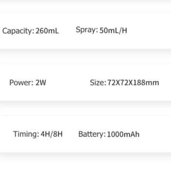 Notre humidificateur d’air et diffuseur d’huile essentielle sans fil rechargeable USB offre une capacité de 260ML, vous permettant de profiter d’une utilisation prolongée sans avoir à le recharger fréquemment. Cette capacité généreuse est idéale pour les petites pièces, créant ainsi une atmosphère saine et équilibrée. Ne vous souciez plus des problèmes liés à la sécheresse de l’air ou de la présence d’odeurs indésirables. Laissez simplement notre humidificateur prendre soin de l’air que vous respirez, vous offrant ainsi une expérience optimale de bien-être.